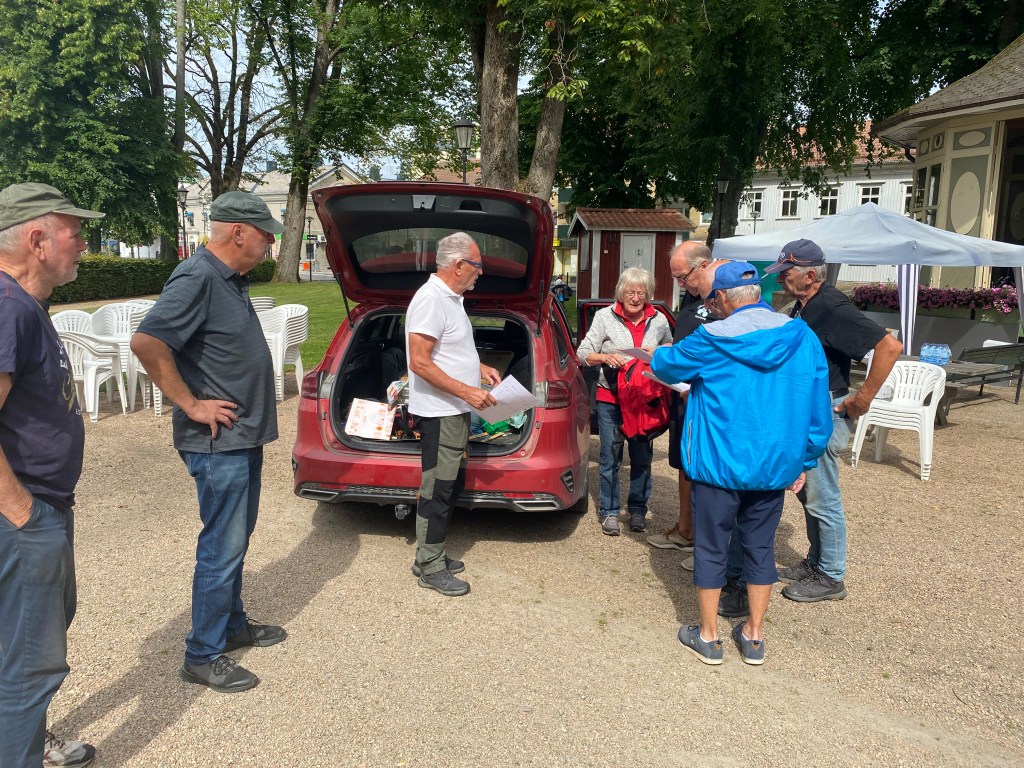 Banläggningen börjar verkligen som ett vitt blad. Här står en grupp och gör upp riktlinjer I centrum står Tävlingsledaren Doris Lundin med Tävlingsgeneralen Bengt Arwidson . Till höger järngänget från Högsäter som drog det största ” banlasset ” i dag .
