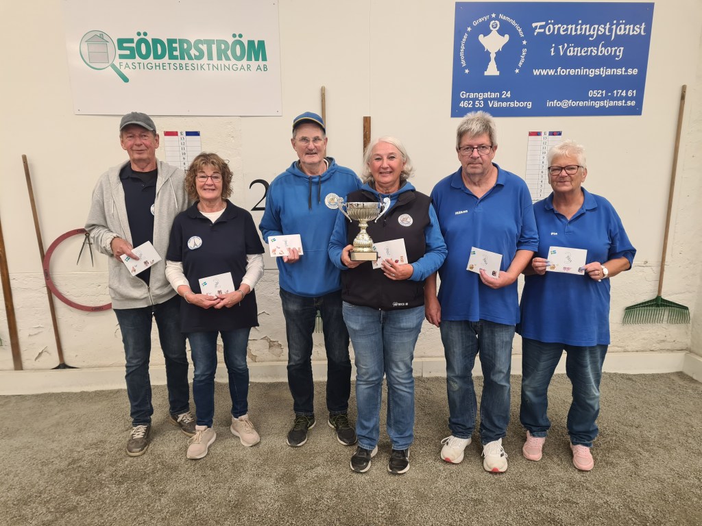 Vinnare i dag blev Tommy Fogelström och Britt Färdig från Ale Boule 2;a blev Tord Magnusson och Bittan Martinsson från hemmaföreningen Lilla Paris , 3;a Håkan och Pia Fredriksson Bäcke Boule . Tilläggas kan att vinnarna fick stiga högst upp på pallen även i Högsäters DM-trippel .