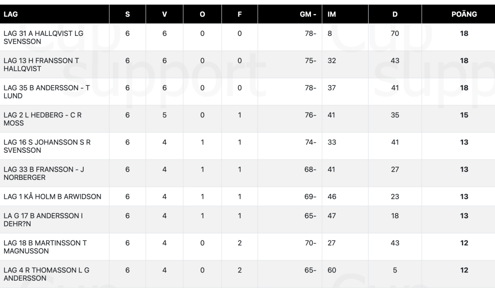 Fördelen med 36 lottningen är att var 3;e omgång är alla i fas , har spelat lika många omgångar. Kolla på sidan RESULTAT så får ni hela listan. Tack Ove.
