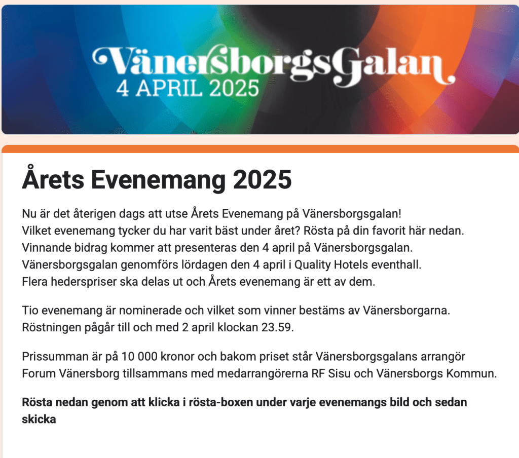Och dom nominerade är…… Publicerat avtommyericson4614 mars, 2025Publicerad iOkategoriserade hhttps://forumvanersborg.se/var-med-och-rosta-pa-arets-evenemang/ Dela detta: Dela på X (Öppnas i ett nytt fönster) X Dela på Facebook (Öppnas i ett nytt fönster) Facebook Gilla Laddar in … Relaterade