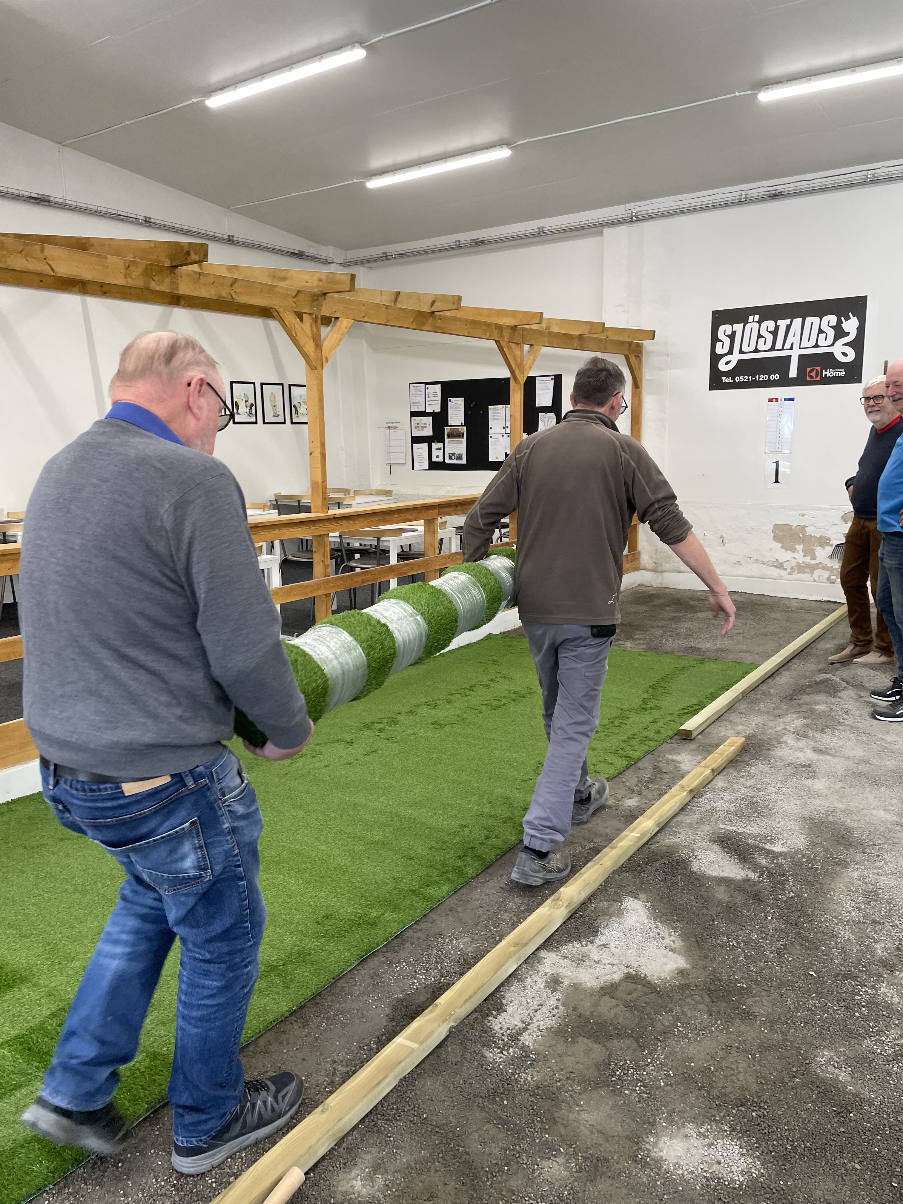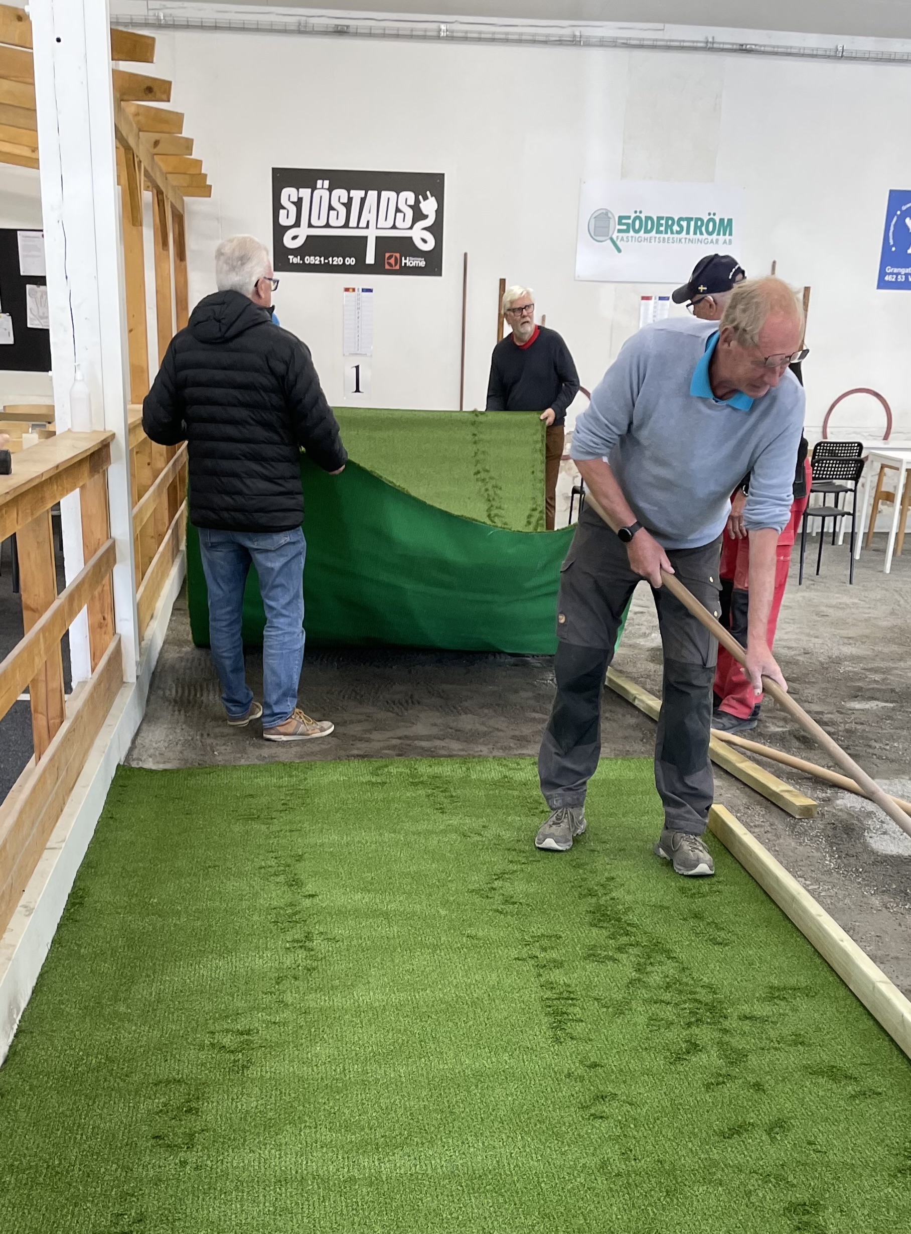 Arbetsdag i boulehallen . Ett 15 tal gubbar på plan och några kvinnor i kafeterian jobbade i dag med att frächa upp i lokalen. Banorna fick en omgång med stenmjöl som sedan fick paddas för att bli hårt och jämt.
