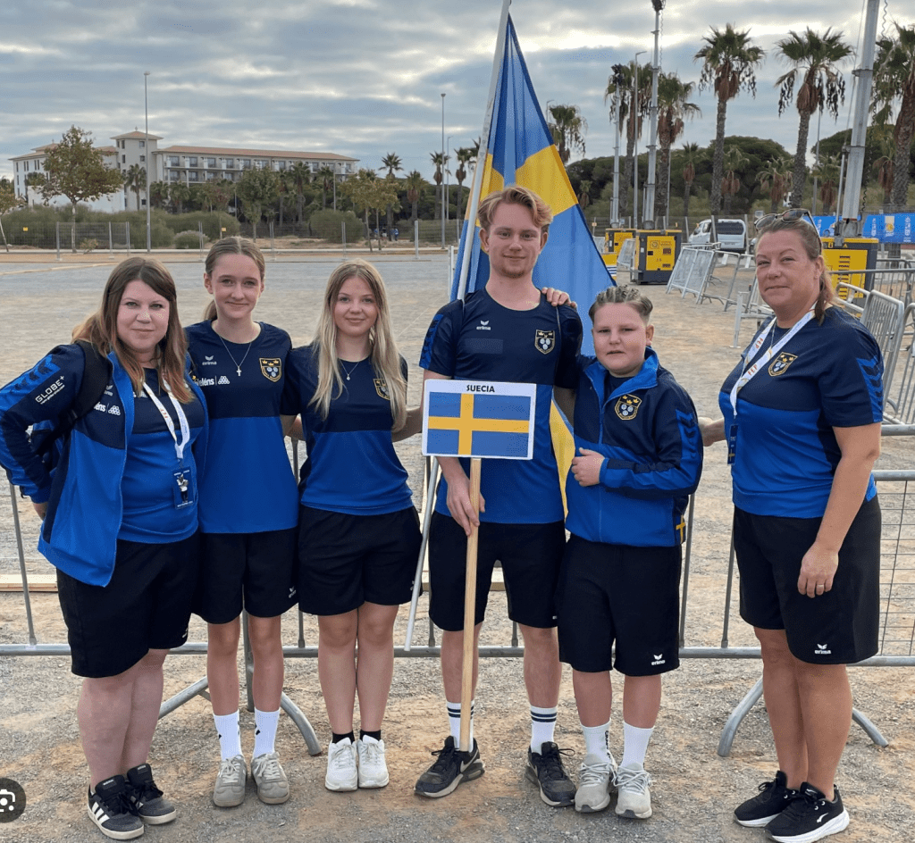 Kian Patron ( 5:a från höger ) var skytt i bronslaget och var vinnare i Lilla Paris Open med Kristian Eklund . Felix Säre’n till vänster om Kian och båda tjejerna Elli och Jael ingick i laget . Felix vann dubbel här i Vänersborg för två år sedan och har nu vuxit ännu mer både i spel och höjd . Utan bra läggare som tjejerna Jael och Elli blir det heller inga medaljer, trippel är ett riktigt lagspel . Numer spelar man trippel med en reserv som kan hoppa in under matchen .