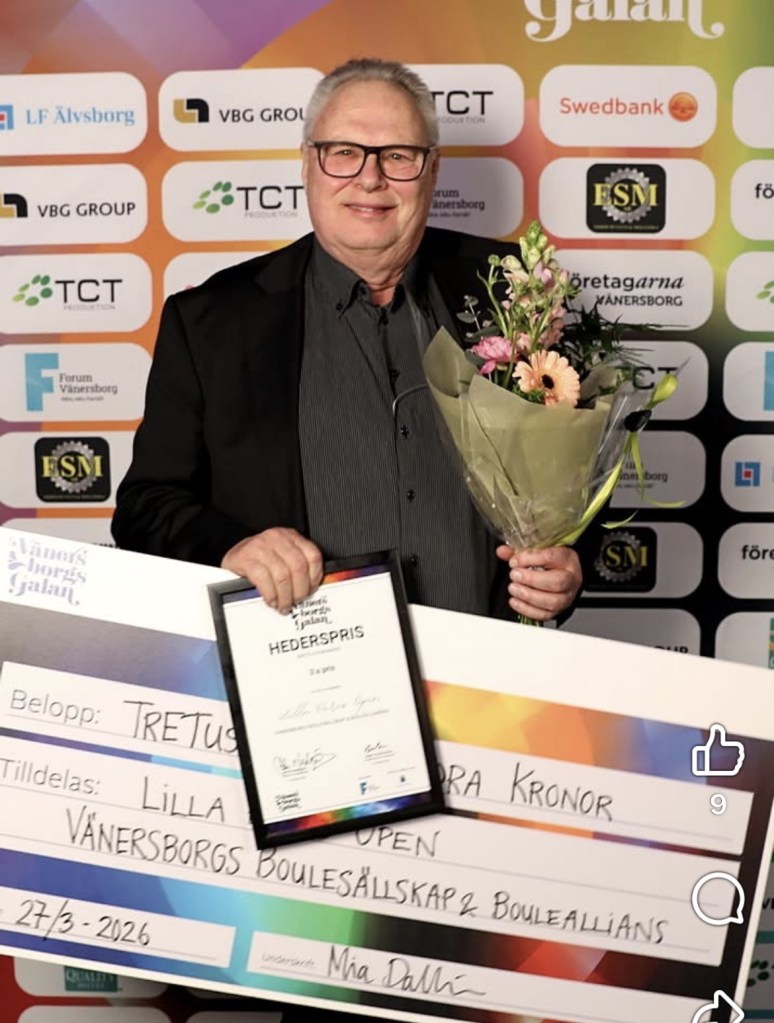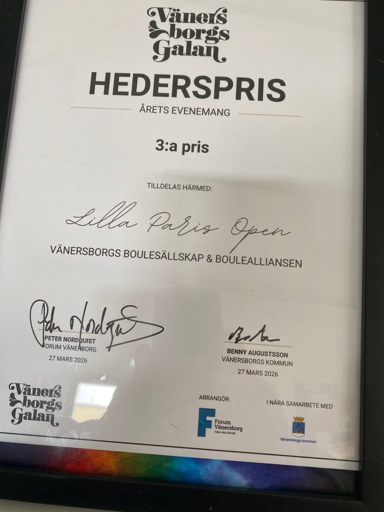 Lilla Paris Open fick hederspris för Årets Evenemang . Under den stora galan fick Ordföranden för Vänersborgs Boulesällskap Tomas Hallqvist äran att hämta 3:e priset , ett diplom och 3500:- .