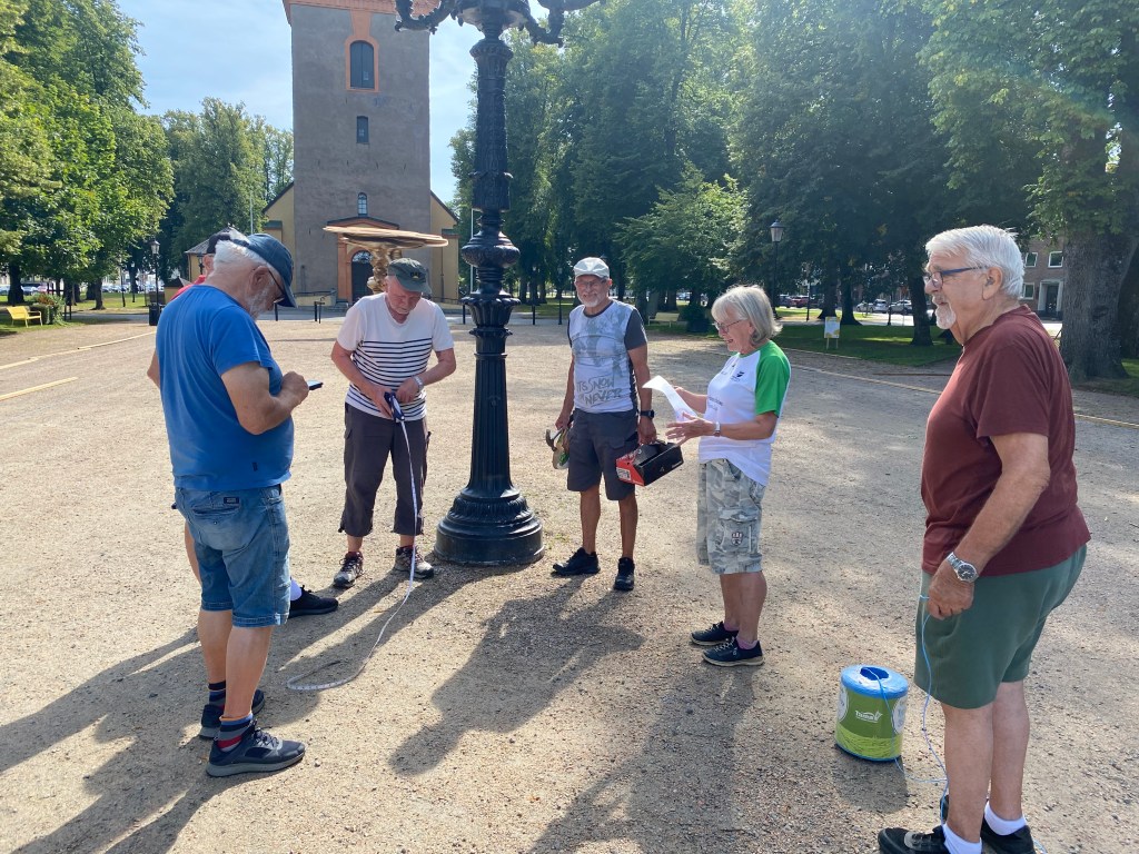 Banläggarna i full fart . Till höger om Mandråparen Banchef Henry till vänster mätansvarig Sune . När mandråparen ( gatlykta )skulle resas för 150 år sedan brast repen och den 1700 kg tunga pjäsen föll så illa att hökaren Johannes Andersson fick sitt huvud krossat och dog . Ni kan vara lugna, nu är den väl förankrad och ni slipper den mitt i spelplanen.