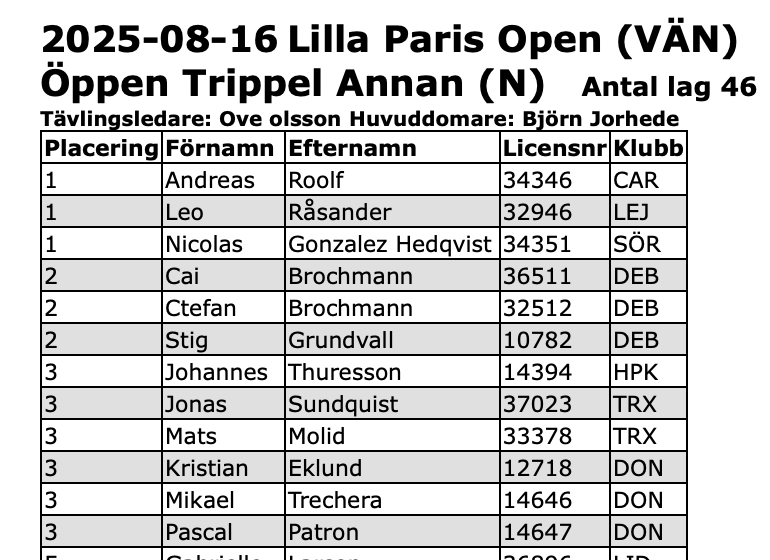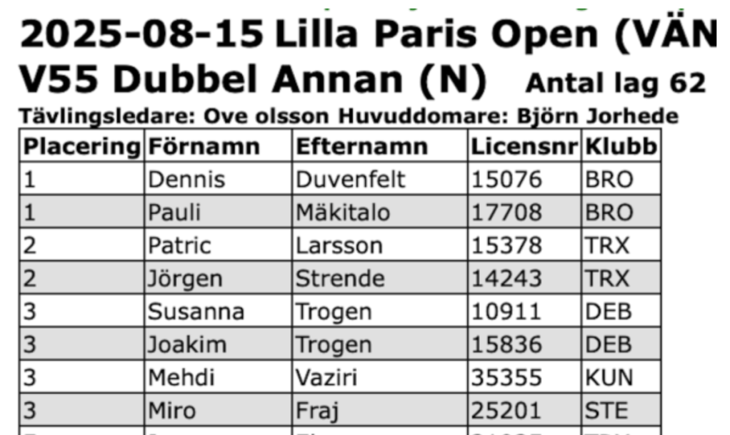 Dennis Duvenfelt briljerade i dag också . Hans U23-landslag tog hem segern i Öppen trippel 43 lag . Spelade mot ett rutinerat lag Cai /Ctefan Brochman och Stig Grundvall som låg under med 3-11 men sedan pressade dom unga spelarna med fint spel , men fick till slut ge sig med siffrorna 9-13.