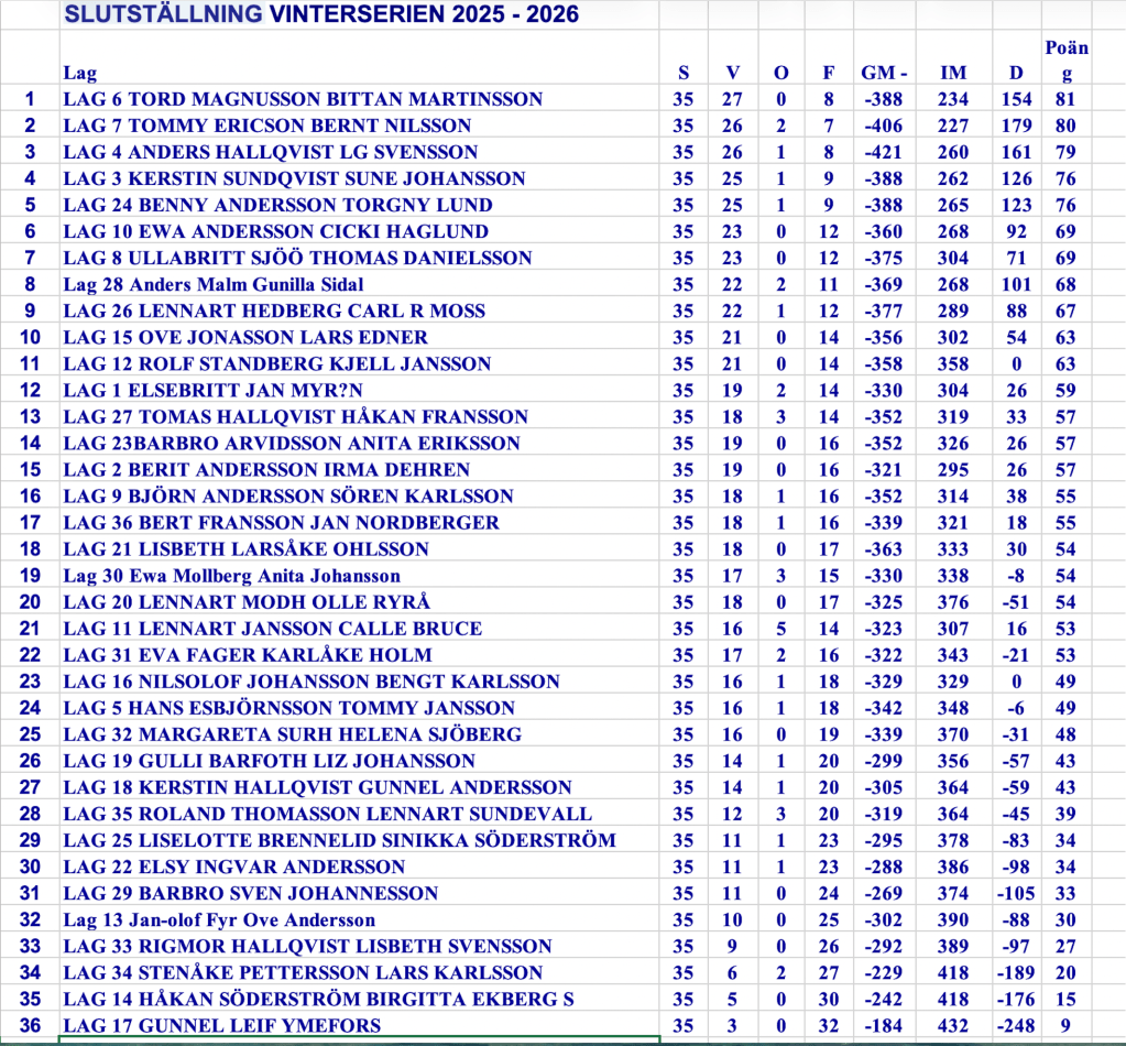 Vinterserien 25/2-26 Slutställning
